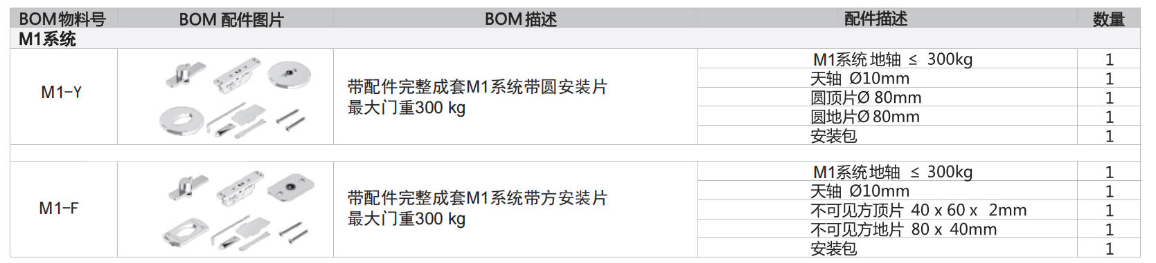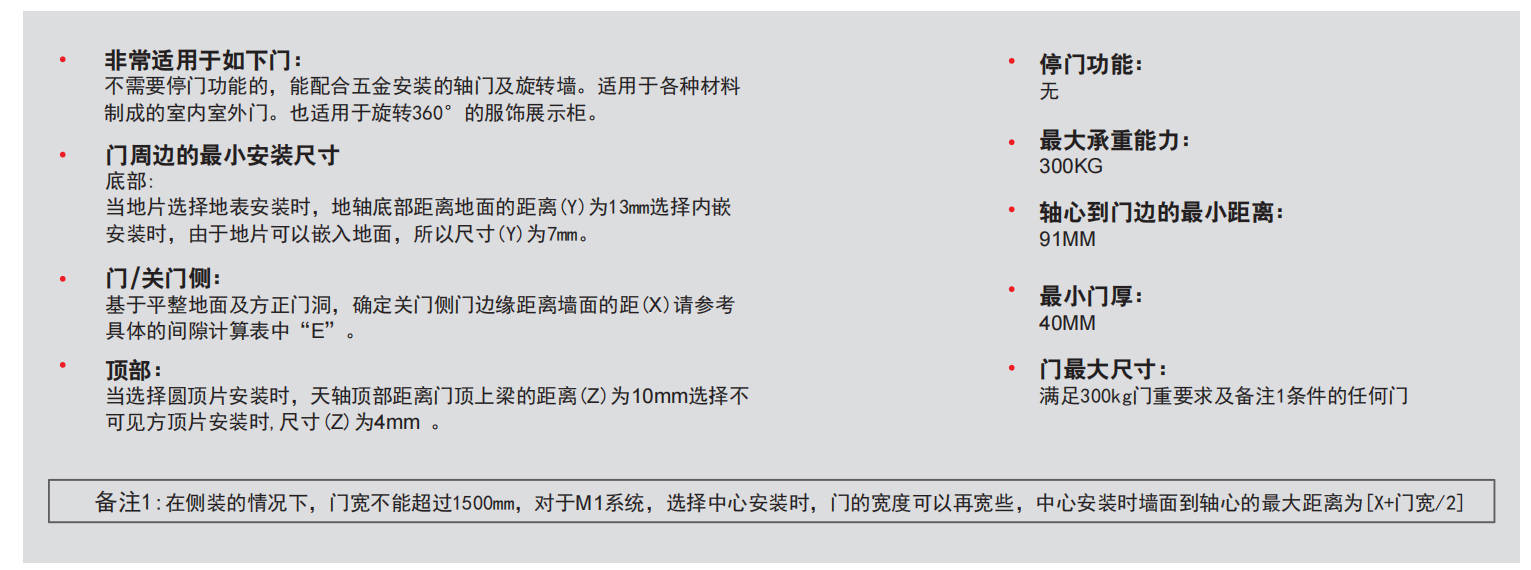 M1系统是中心天地轴系统中是最紧凑的一款,适用于单向和双向门,可360°旋转,没有停门及自动关门等功能;